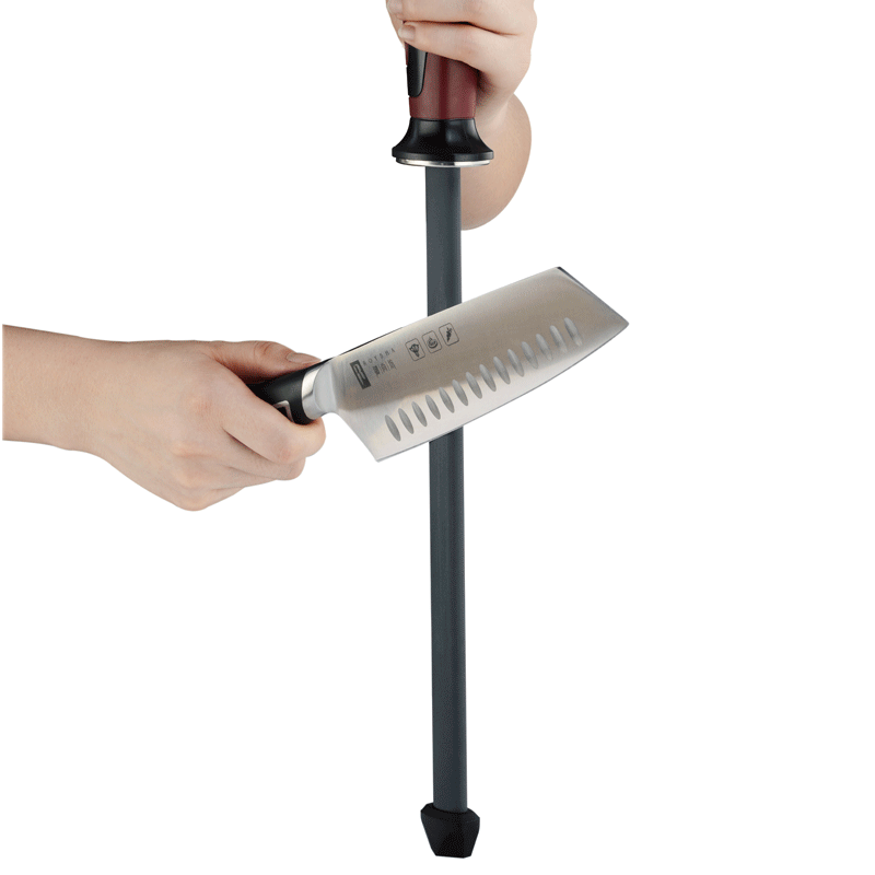 Oprzyj koniec ostrzałki na płaskiej powierzchni. Zachowując odpowiedni kąt ostrzenia (najlepiej 20°) naostrz nóż przesuwając go od rączki do końca ostrzałki.