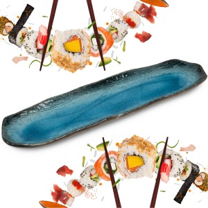 Opis: Ceramiczny talerz do serwowania sushi w różnych odcieniach niebieskiego koloru o wymiarze 34cm x 10cm firmy EMRO AZIATICA. Bardzo elegancki ceramiczny talerzyk do podawania sushi, zdecydowanie urozmaici i nada klimatu podczas spożywania tej przepysznej potrawy!