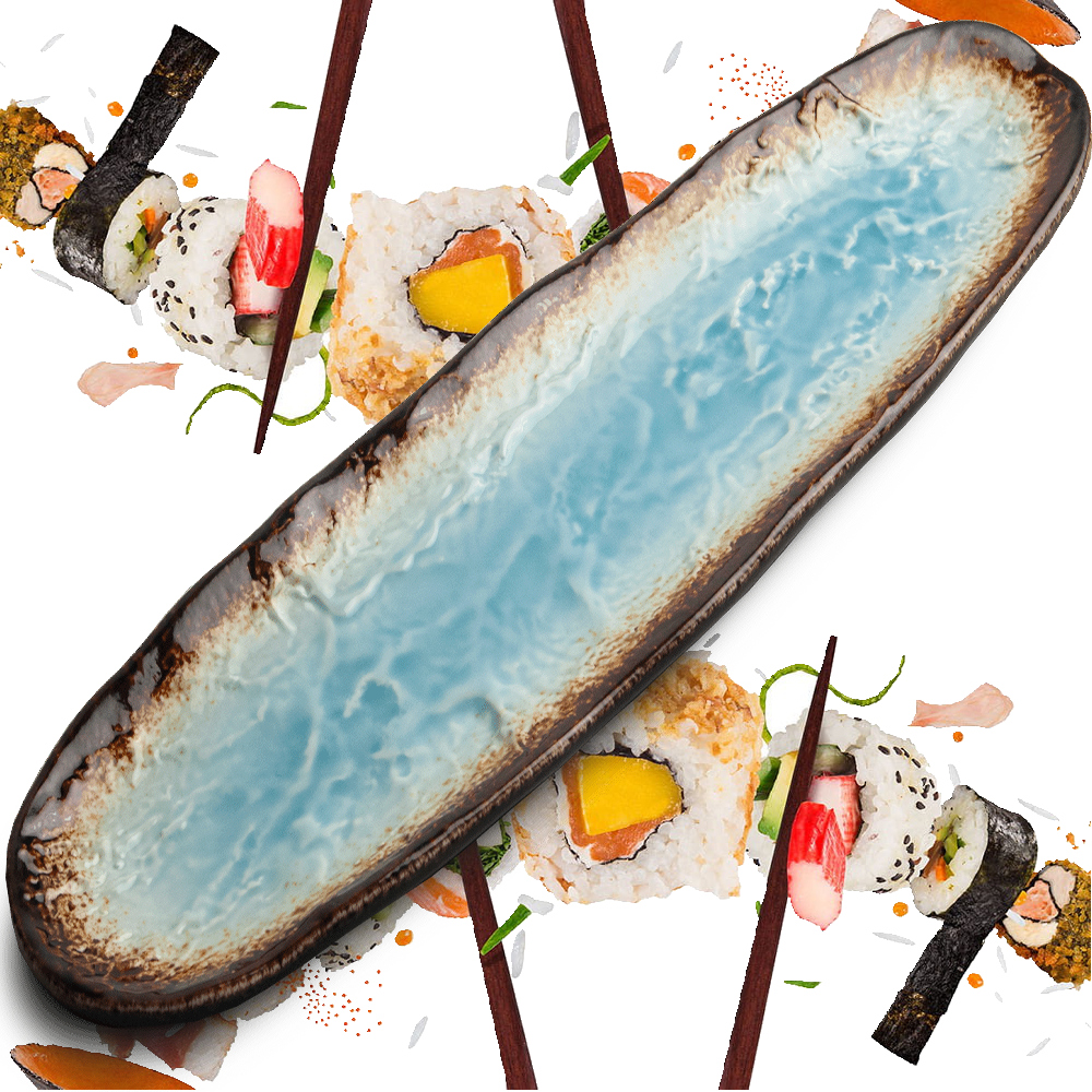Opis: Elegancki, wydłużony talerz ceramiczny zaprojektowany do efektownego podawania sushi, sashimi oraz drobnych przekąsek. Połączenie ciemnej brązowej powierzchni z błękitnym nadaje mu nowoczesny, wyrazisty charakter, a zaokrąglona forma podkreśla estetykę serwowanych potraw.