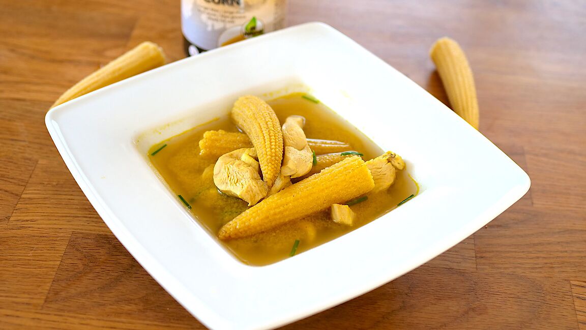Rosół drobiowy z curry i kukurydzą, swój smak zawdzięcza w dużej mierze mini kolbą kukurydzy oraz mięsu drobiowemu wraz z aromatycznym imbirem. Wywar można przygotować na przykład dzień wcześniej, a następnie dodać do niego mięso.