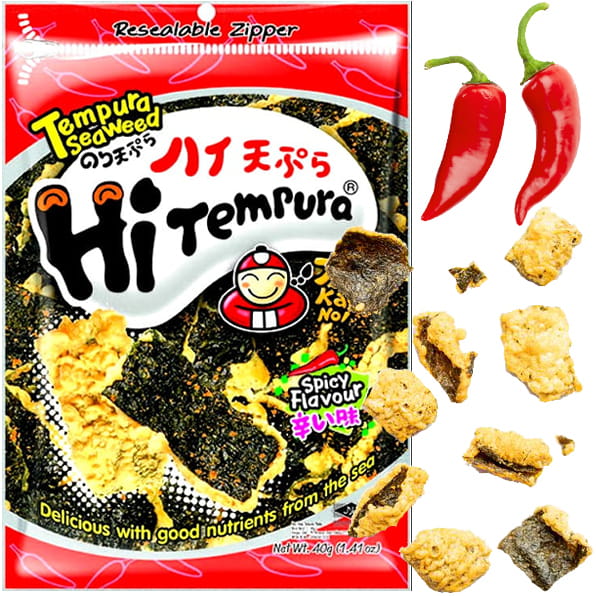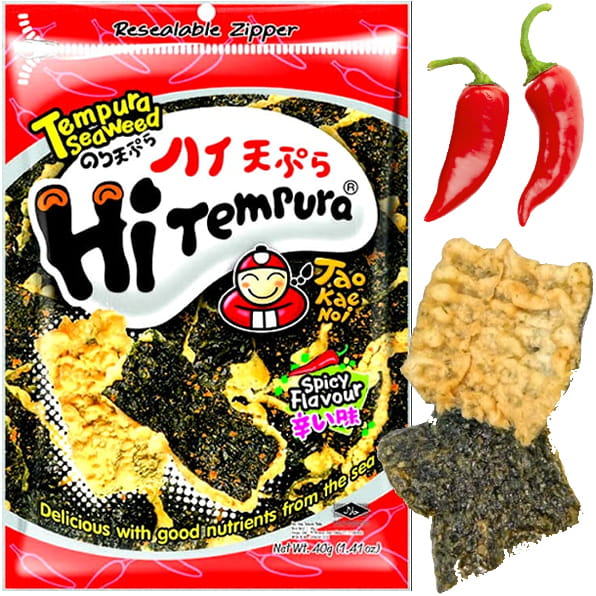 Opis: Chrupiące ostre wodorosty w tempurze firmy Tao kae noi w opakowaniu. Trochę inne niż tradycyjne snacki z wodorostów, dodatkowo smażone w panierce tempurze na głębokim oleju. W smaku ostre, bardzo smaczne.