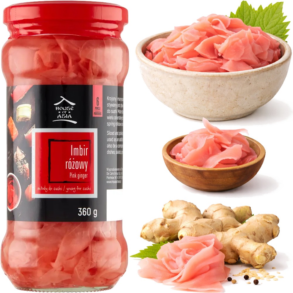 Opis: Chrupiący młody imbir do sushi różowy w słoiku o pojemności 360g renomowanej firmy House of Asia. Wysokiej jakości marynowany imbir do sushi, ceniony za świeży aromat oraz delikatnie pikantny smak. Cienkie plasterki różowego imbiru doskonale komponują się z sushi, sashimi, daniami z ryżu oraz potrawami kuchni azjatyckiej. Produkt pomaga oczyszczać kubki smakowe pomiędzy kolejnymi kęsami, podkreślając smak serwowanych potraw.