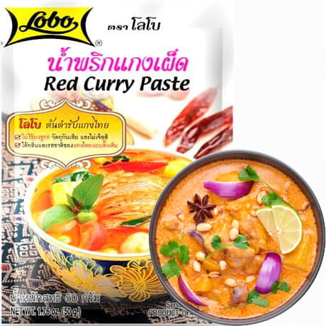 Opis: Czerwona pasta curry firmy Lobo w opakowaniu 50g. Gotowa mieszanka przypraw oraz pasty krewetkowej do przygotowania tajskiego czerwonego curry.