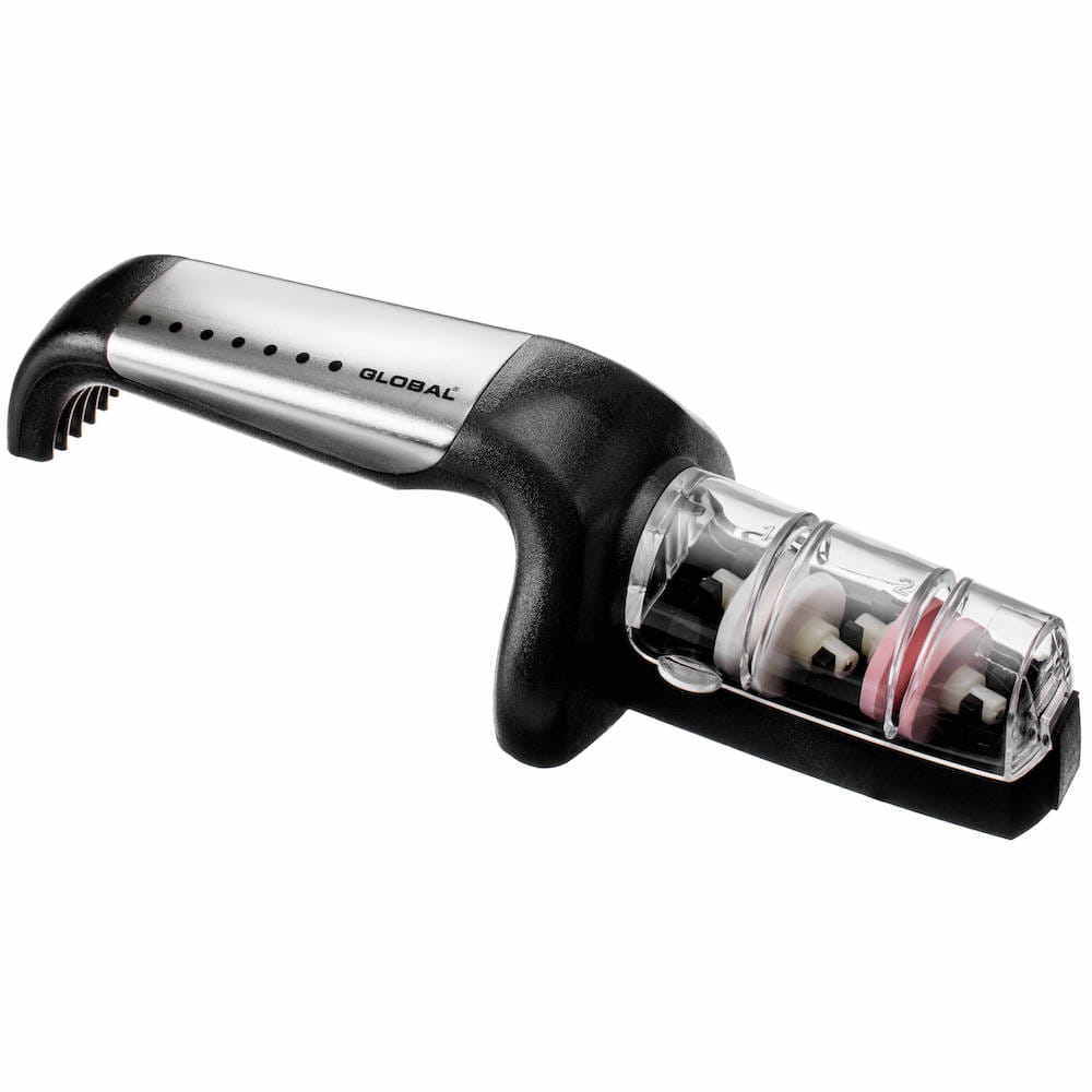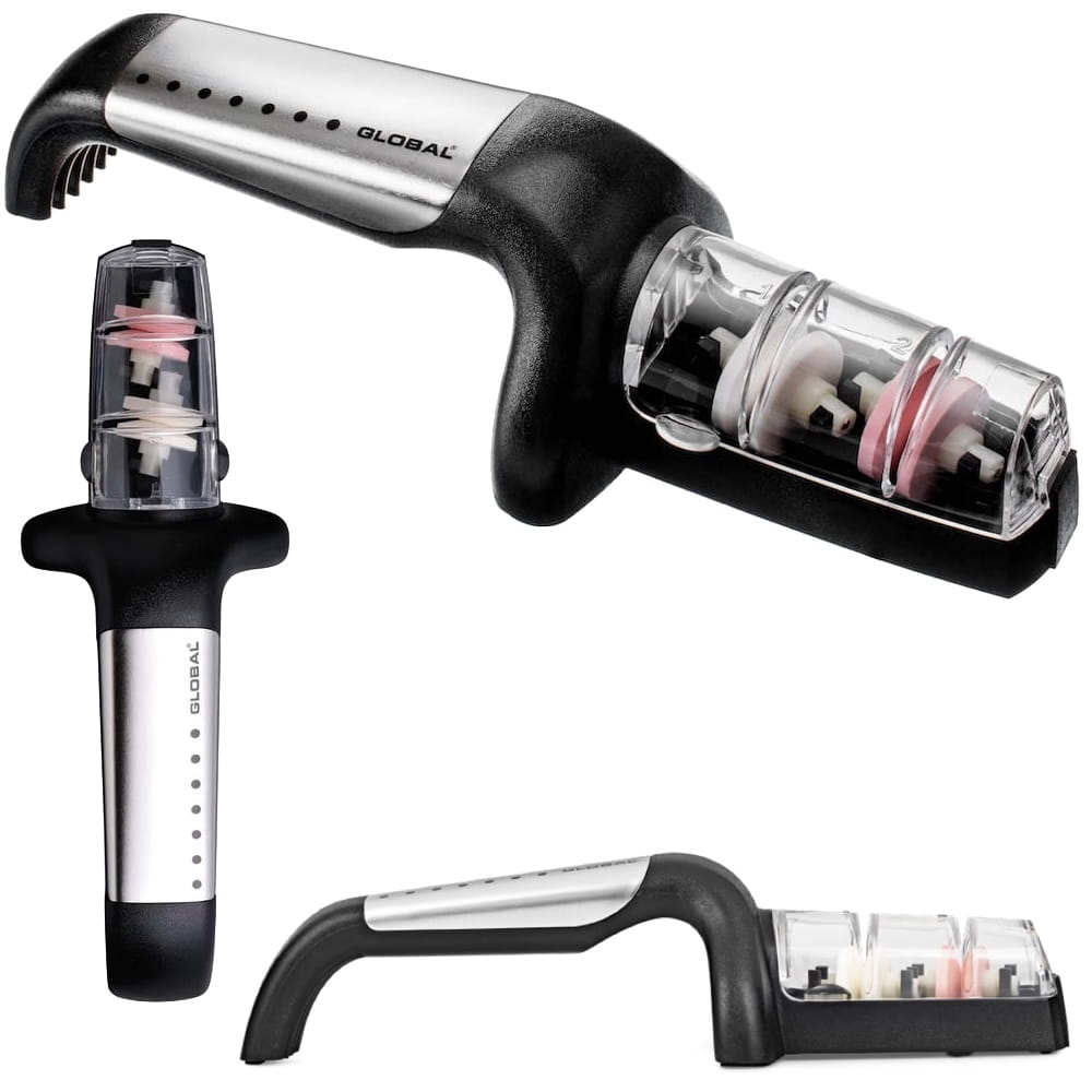 Opis: Dwufazowa ostrzałka ceramiczna, zaprojektowana specjalnie dla noży Global i przeznaczona do ostrzenia wszystkich rodzajów noży, z wyjątkiem tych o szlifach jednostronnych, np. tradycyjnych noży japońskich. Dzięki wodzie proces ostrzenia przebiega szybciej, a fabrycznie ustawione otwory ułatwiają naostrzenie noża pod odpowiednim kątem. Gumowany uchwyt i podstawa mają właściwości przeciwpoślizgowe.