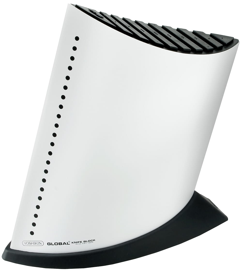 Opis: Praktyczny zestaw noży Global stanowi znakomity fundament indywidualnej kolekcji kuchennej. Blok w kształcie żaglowca wykonano ze stali nierdzewnej, zdobionej charakterystycznymi kropkami. Jego czarna podstawa ma właściwości antypoślizgowe. Blok posiada 10 otworów różnej wielkości, na 9 noży oraz pręt ostrzący lub nożyczki, co pozwala stworzyć komplet wedle własnego uznania. Podstawę można zdjąć, żeby dokładnie wyczyścić otwory i zapobiec odkładaniu się resztek pożywienia.
