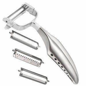 Opis: Funkcjonalna obieraczka z wymiennymi ostrzami, która jest wspaniałym udogodnieniem dla szefów kuchni. Innowacyjne narzędzie projektu Komina Yamady posiada trzy różne rodzaje ostrzy: