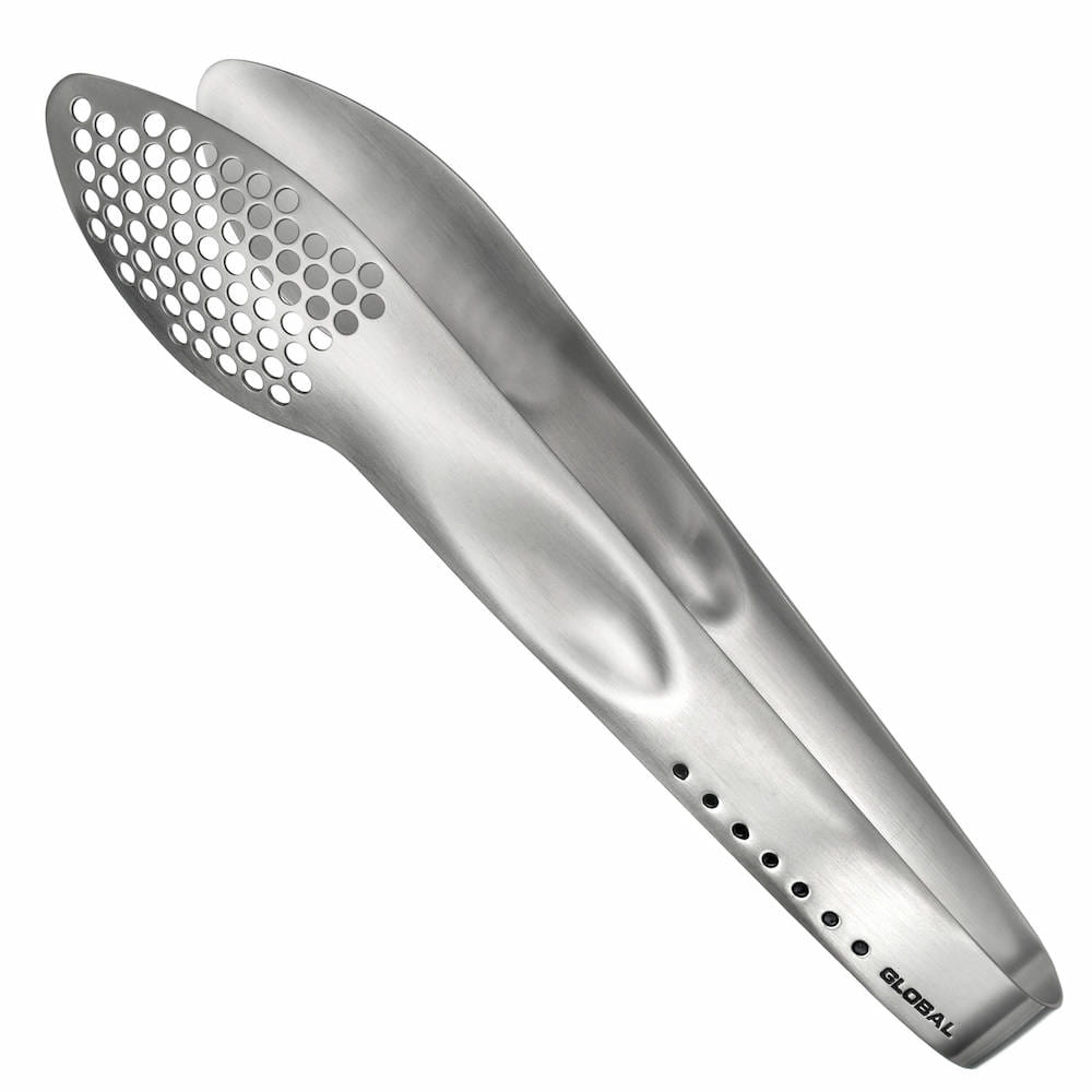 Opis: Uniwersalne szczypce marki Global to praktyczne narzędzie kuchenne, służące do gotowania, serwowania potraw i przenoszenia produktów, których nie należy dotykać. Jedna z końcówek jest dziurkowana, co ułatwia odprowadzanie płynu z takich potraw, jak szparagi, szpinak czy pieczarki. Dzięki ramionom ze stali nierdzewnej szczypce doskonale się nadają do przewracania mięsa lub tofu na patelni i na grillu.