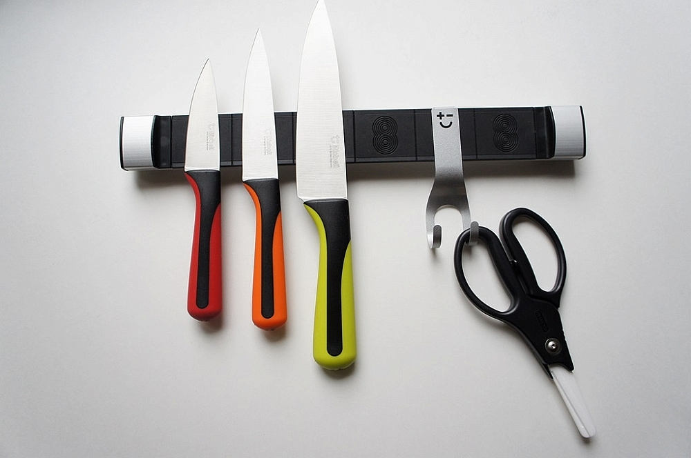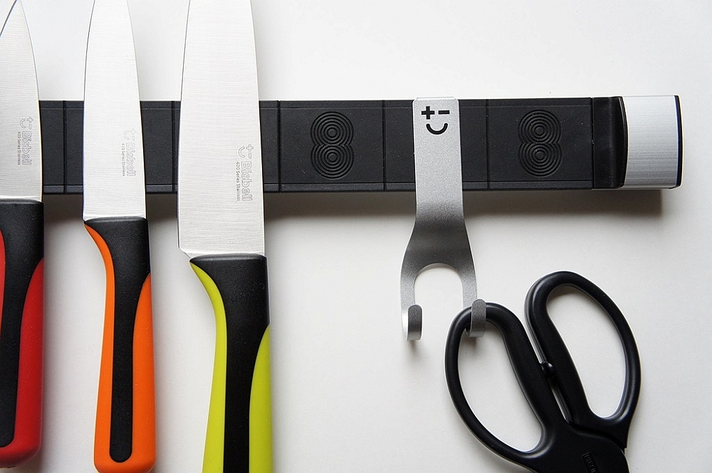 Opis: Podwójny haczyk z solidnego metalu, mocowany do listwy magnetycznej na noże. Pozwala zawiesić np. rękawicę, szpatułkę, nożyce kuchenne, ręcznik, klucze czy kubek. Doskonały dodatek, który zwiększa praktyczność magnetycznej listwy na noże Bisbell.