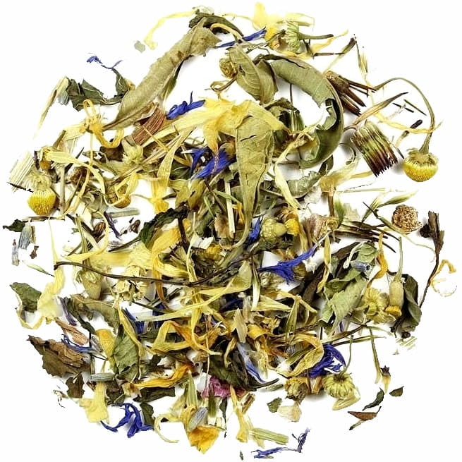 Składniki: Liście jeżyny, echinacea (jeżówka purpurowa), kwiatki rumianku, zielony owies, zielony rooibos, verbena cytrynowa, liście mięty pieprzowej, tymianek, kwiaty lawendy, nagietek i bławatek.