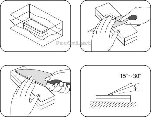 Namocz kamień w wodzie lub użyj oleju do ostrzałek firmy Taidea. Postaw ostrzałkę na płaskiej powierzchni. Zacznij wygładzać ostrze zaczynając od gradacji 1000. Dokończ polerowanie używając gradacji 3000.