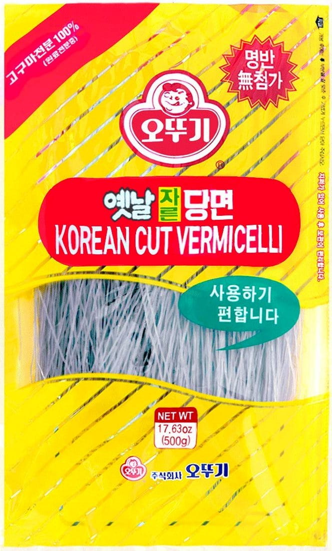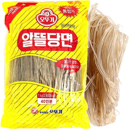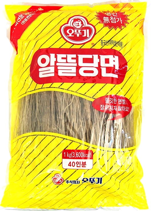 Opis: Koreański makaron z batatów (słodkich ziemniaków) firmy Ottogi w opakowaniu 500g. Długi, elastyczny makaron. Wyglądem przypomina trochę makaron sojowy, jednak jest trochę ciemniejszy. Sposób przygotowania: zalewamy wrzątkiem lub wrzucamy do gotującej się wody, po chwili sprawdzamy, czy jest już gotowy. Opłukujemy zimną wodą oraz odsączamy. Używany głównie do zup oraz do potraw stir-fry. W kuchni koreańskiej używany głównie do potrawy japchae. Makaron zapakowany w specjalne opakowanie ze struną, które można zamykać.