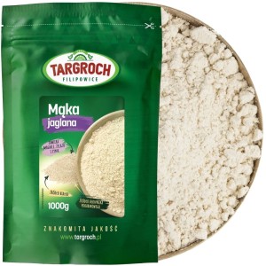 Opis: Mąka jaglana w opakowaniu strunowym firmy Targroch. Pozyskiwana jest ze zmielonych i obłuszczonych ziaren prosa. Ma charakterystyczny orzechowy aromat i słodkawo gorzki smak. Ze względu na te walory smakowe, stosunkowo często stosuje się ją do wypieków, deserów, naleśników, słodkiego pieczywa, placków oraz do zagęszczania sosów i zup. Ma dość neutralny smak i nie tworzy grudek. Coraz częściej mąka jaglana zastępuje tradycyjną mąkę pszenna, ponieważ ma w swoim składzie o wiele więcej witamin oraz składników odżywczych. Ponadto posiada tylko śladowe ilości glutenu.