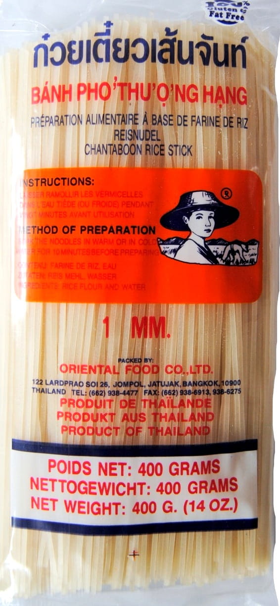 Opis: Makaron ryżowy 1mm firmy Farmer Brand w opakowaniu 400g. To makaron o dość drobnej tasiemce, idealny do zup czy sajgonek. Można go użyć do wielu innych potraw azjatyckich. Sposób przygotowania: zalać makaron na 10 minut wodą. Po upływie tego czasu gotować kilka minut do miękkości i odcedzić.