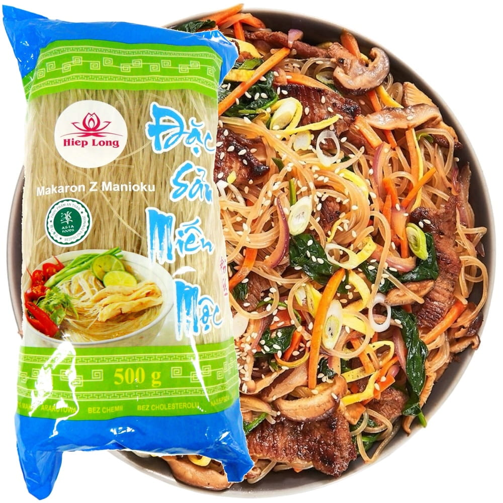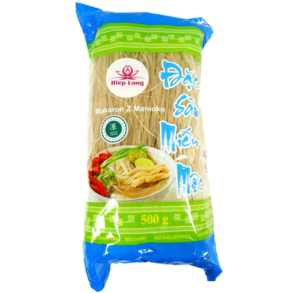 Opis: Makaron z manioku firmy Hiep Long w opakowaniu 500g. Jest grubszy niż makaron sojowy, dlatego po ugotowaniu idealnie nadaje się do smażenia, jako farsz do sajgonek lub do azjatyckich zup. Makaron ma nitkę średnicy około 1,1mm.