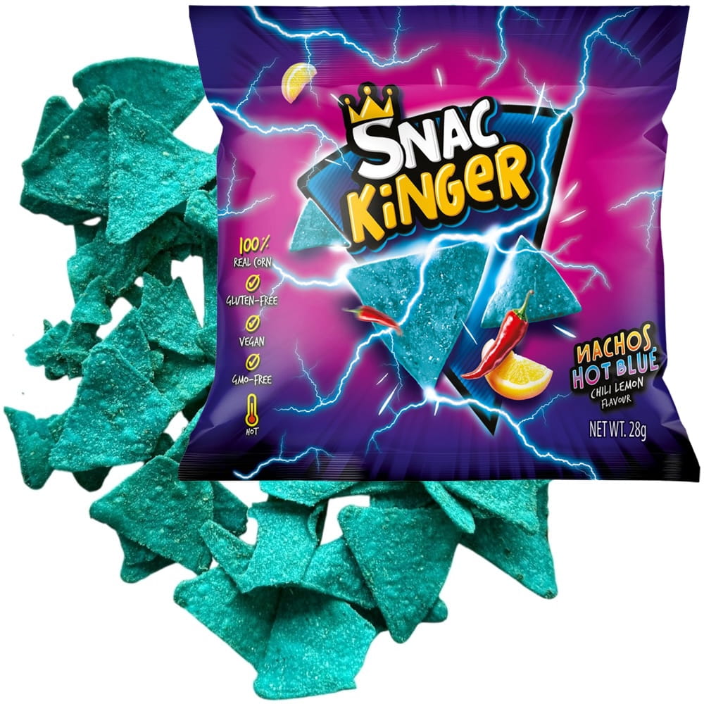 Opis: Mała paczka, wielki smak! SNAC KINGER Niebieskie Nachosy w wersji HOT 28g to intensywnie chrupiące chipsy tortilla z niebieskiej kukurydzy, które łączą w sobie pikantne chili i orzeźwiającą cytrynę. Idealne jako szybka przekąska w podróży, szkole lub pracy.