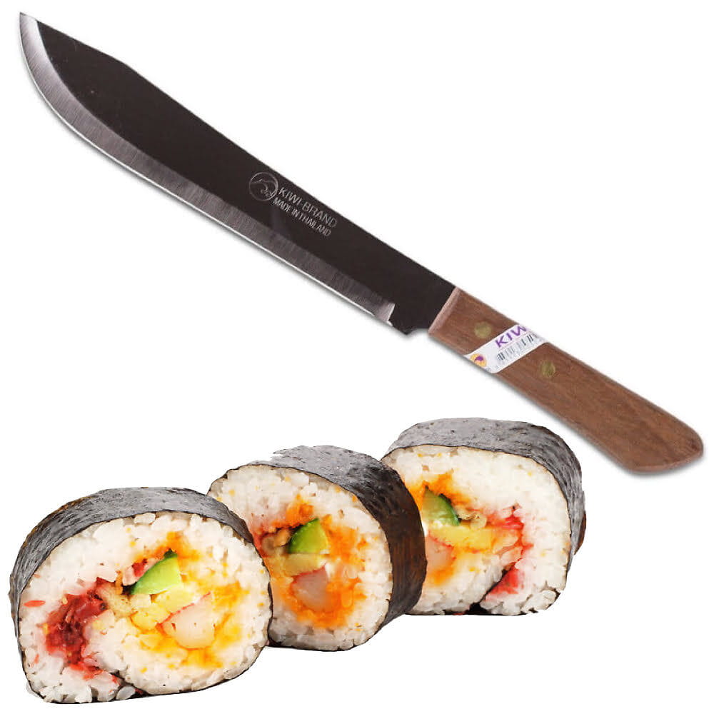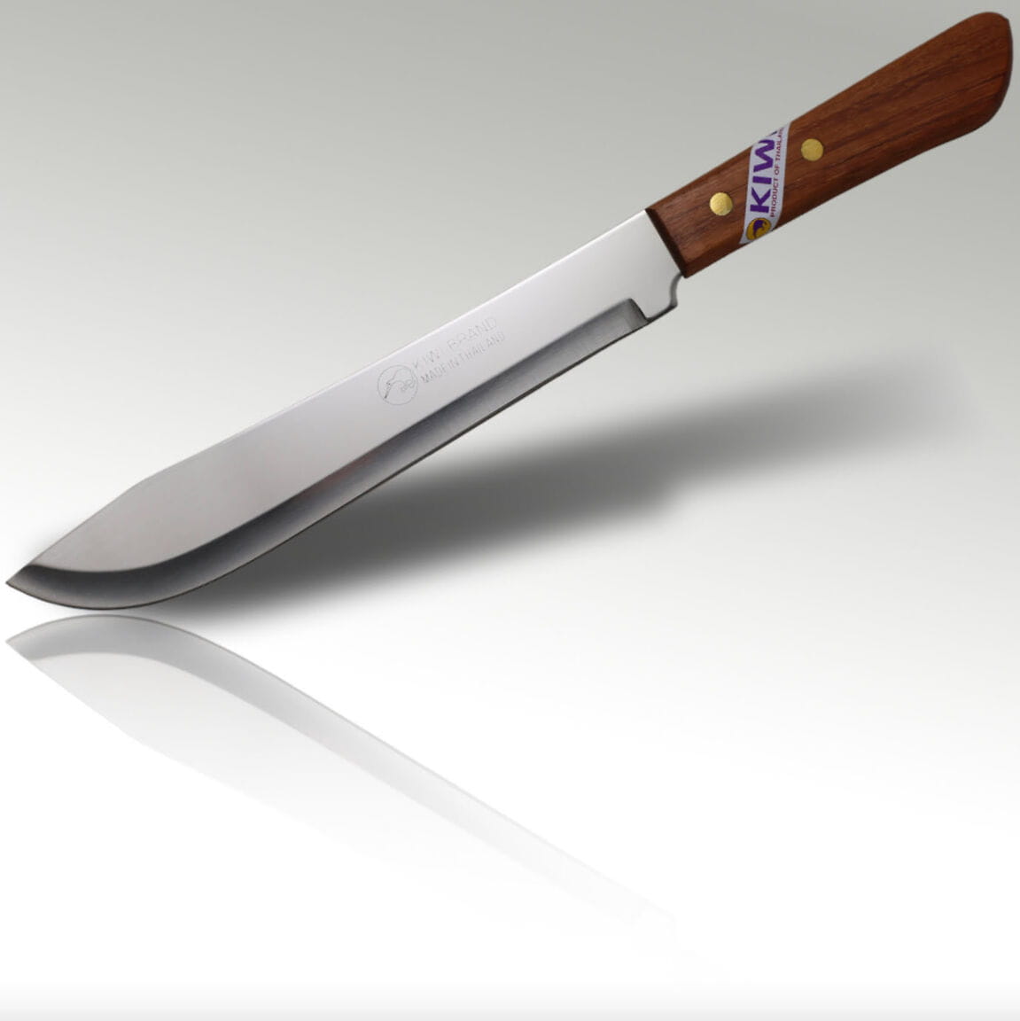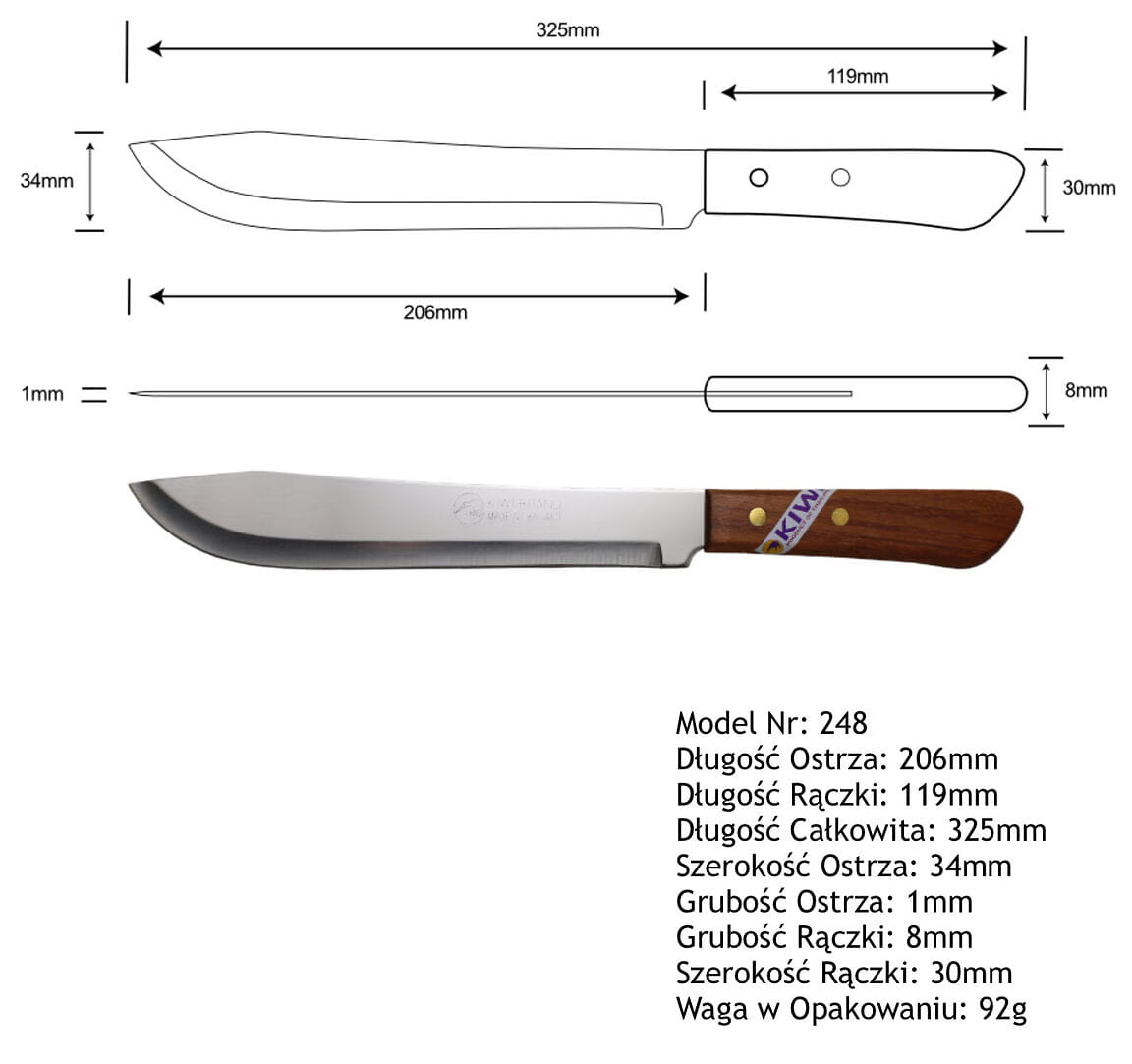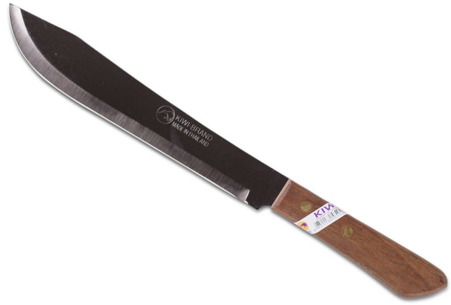 Opis: Nóż do mięsa mini maczeta o wymiarach 32,5cm tajskiej firmy KIWI, długi, przeznaczony do cięcia mięsa. Posiada drewnianą rączkę, która dobrze leży w dłoni. Wyglądem przypomina miniaturową maczetę. Bardzo ostry, świetnie sprawdza się w kuchni. Wykonany ze stali nierdzewnej oraz drewna impregnowanego.