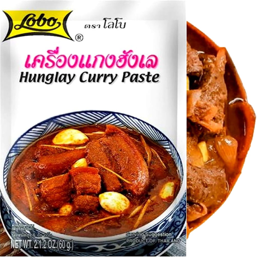 Opis: Pasta curry hunglay firmy Lobo w opakowaniu 50g. Mieszanka odpowiednich przypraw i ziół, do przygotowania prawdziwego tajskiego gulaszu z północy kraju. Gulasz jest bardzo prosty do zrobienia, a rezultat wyśmienity. Przepis na tajski gulasz hunglay w opisie szczegółowym.
