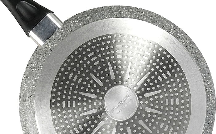 Patelnia 28 cm Dura Induction włoskiej firmy Flonal. Korpus patelni wykonany jest z kutego aluminium. Wzmocniono go wytrzymałą obręczą, dzięki czemu patelnia jest odporna na zgniatanie. Ergonomiczna rączka wykonana jest z bakelitu o miękkim wykończeniu, co pozwala na bezpieczne i wygodne chwytanie. Patelnia pokryta jest bardzo wytrzymałą, granitową powłoką nieprzywierającą Magma Tech Plus z mineralnymi wzmocnieniami, nie zawierającą szkodliwych materiałów PFOA oraz niklu.