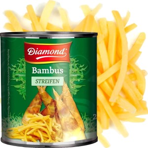 Opis: Pędy bambusa renomowanej firmy Diamond w dużej puszcze o pojemności 2,84kg. Duże opakowanie pędów w formie nitek w zalewie. Idealnie nadaje się do barów oraz lokalów gastronomicznych. Pędy bambusa wykorzystywane są w kuchni azjatyckiej praktycznie do większości dań z warzywami.