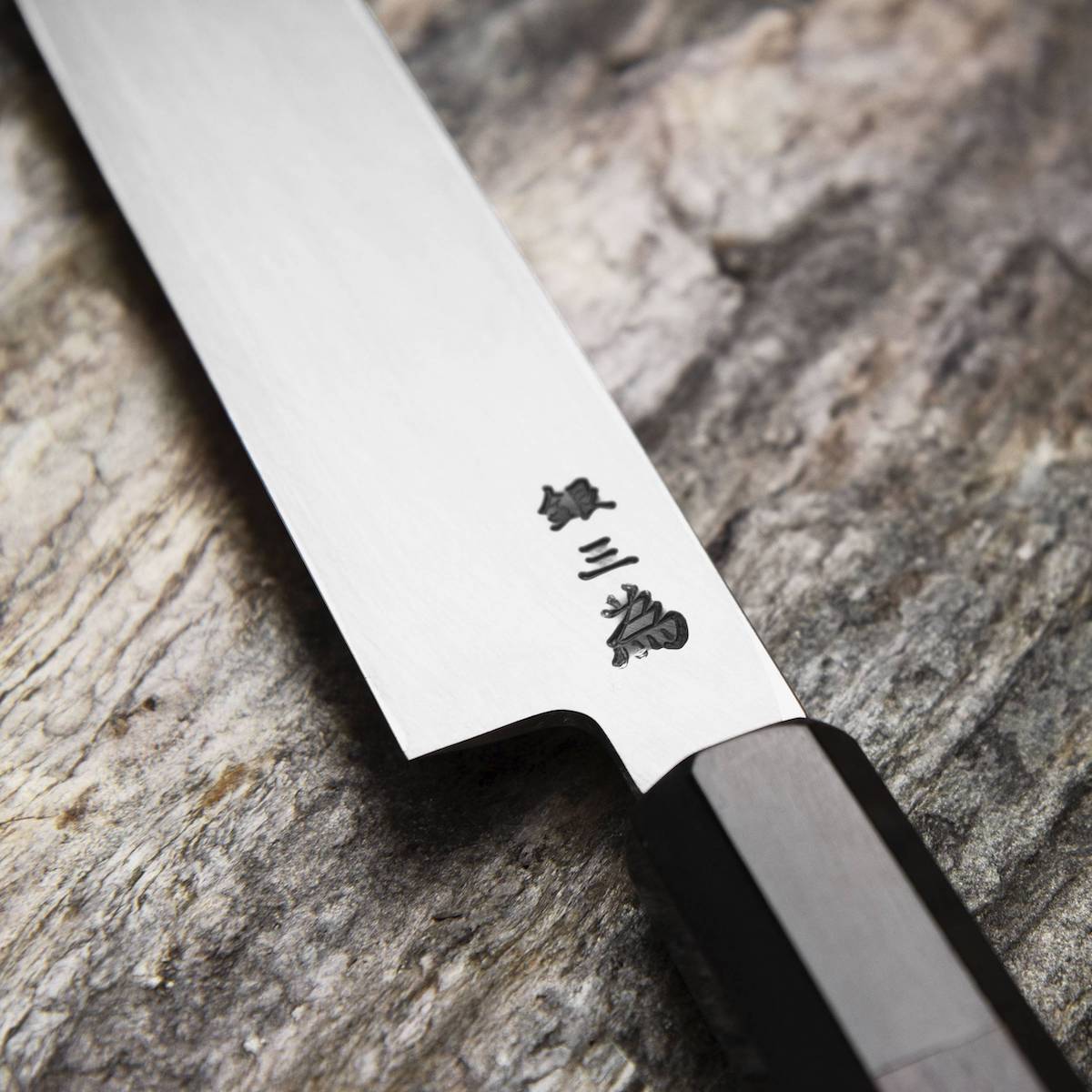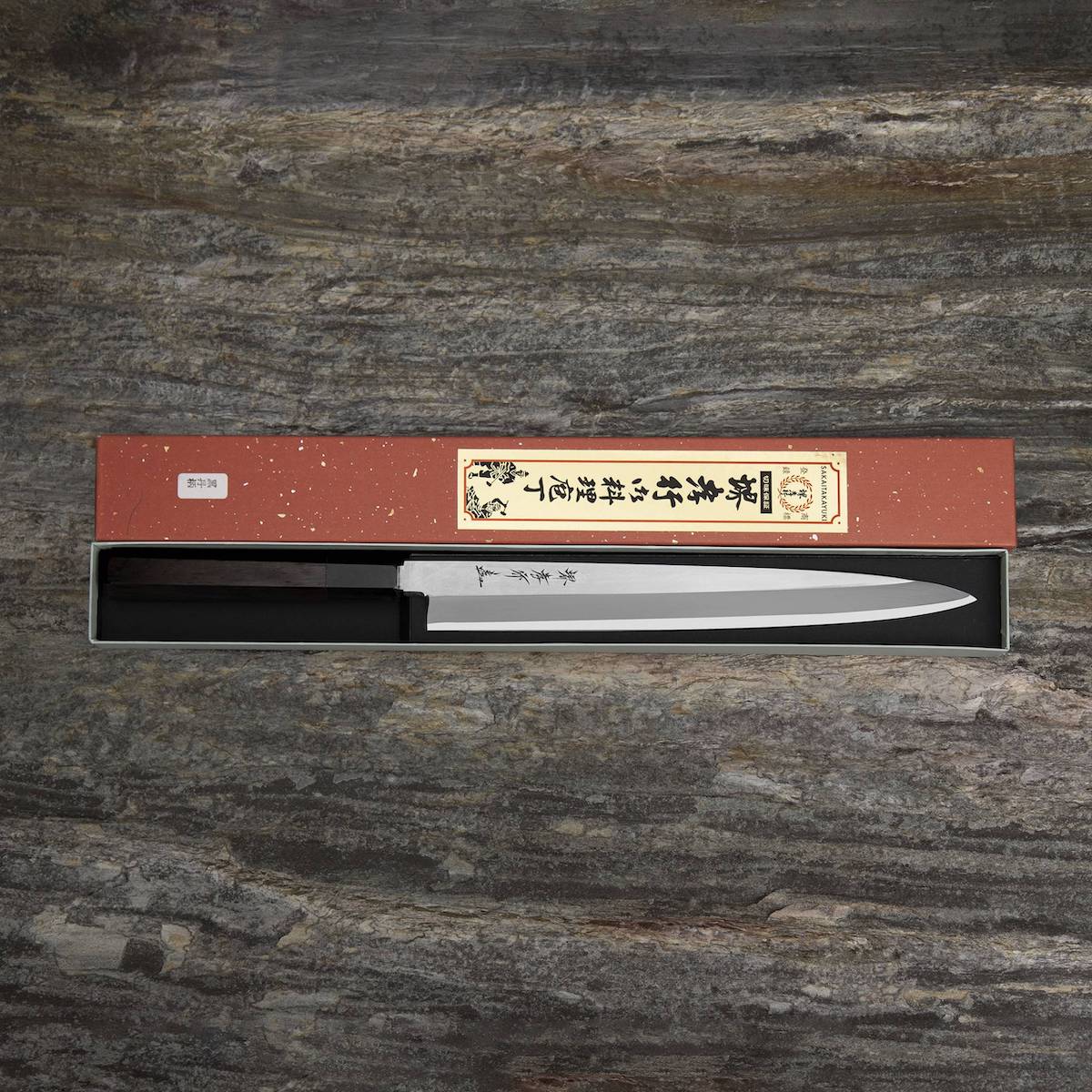 Opis: Nóż do sashimi (Yanagi) to tradycyjny japoński nóż, który służy do krojenia świeżych filetów na niemal przezroczyste plastry. Znakomicie się sprawdza podczas przygotowywania sushi, rybnego carpaccio oraz innych potraw z bardzo delikatnych składników. Długie, wąskie i sztywne ostrze zapewnia drobiazgową precyzję, a jednostronny szlif – czyste cięcie. Nożem Yanagi najlepiej wykonywać jednostajny ruch w jednym kierunku: do siebie.