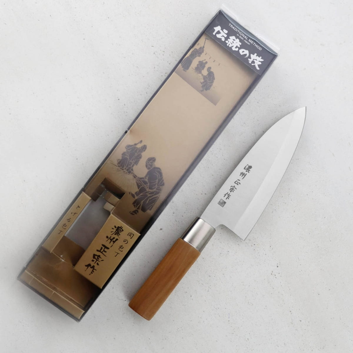 Opis: Tradycyjny japoński nóż z grubą, zwężającą się klingą, który służy do odgławiania i filetowania ryb w taki sposób, żeby nie uszkodzić ich delikatnego mięsa. W Japonii bywa często używany do sprawiania mięsa drobiowego, ale nie jest klasycznym tasakiem i nie powinno się nim mocno uderzać. Aby przeciąć ość, wystarczy lekko nacisnąć grzbiet noża i wykonać szybkie, precyzyjne cięcie. Ostry czubek i krótkie ostrze ułatwiają kontrolę ruchów, co jest szczególnie ważne, gdy trzeba dostać się nożem do ciasnych miejsc.