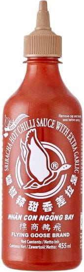 Opis: Sos chili sriracha z czosnkiem firmy Flying Goose Brand w butelce z dozownikiem 455ml. Idealna kompozycja ostrego smaku chili wraz z intensywnym aromatem i smakiem czosnku. Bardzo popularny tajski sos chili.