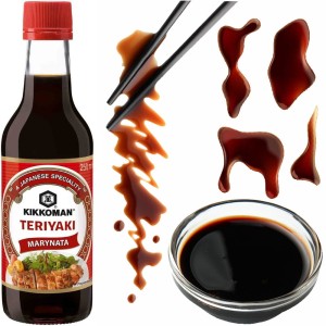 Opis: Sos teriyaki japońskiej firmy Kikkoman w butelce o pojemności 250ml. Marynata do różnego rodzaju mięs, ryb oraz przyprawa na bazie sosu sojowego. Idealna do smażonego oraz grillowanego mięsa. Niesamowity smak zawdzięcza odpowiedniej kompozycją ziół oraz cukru.