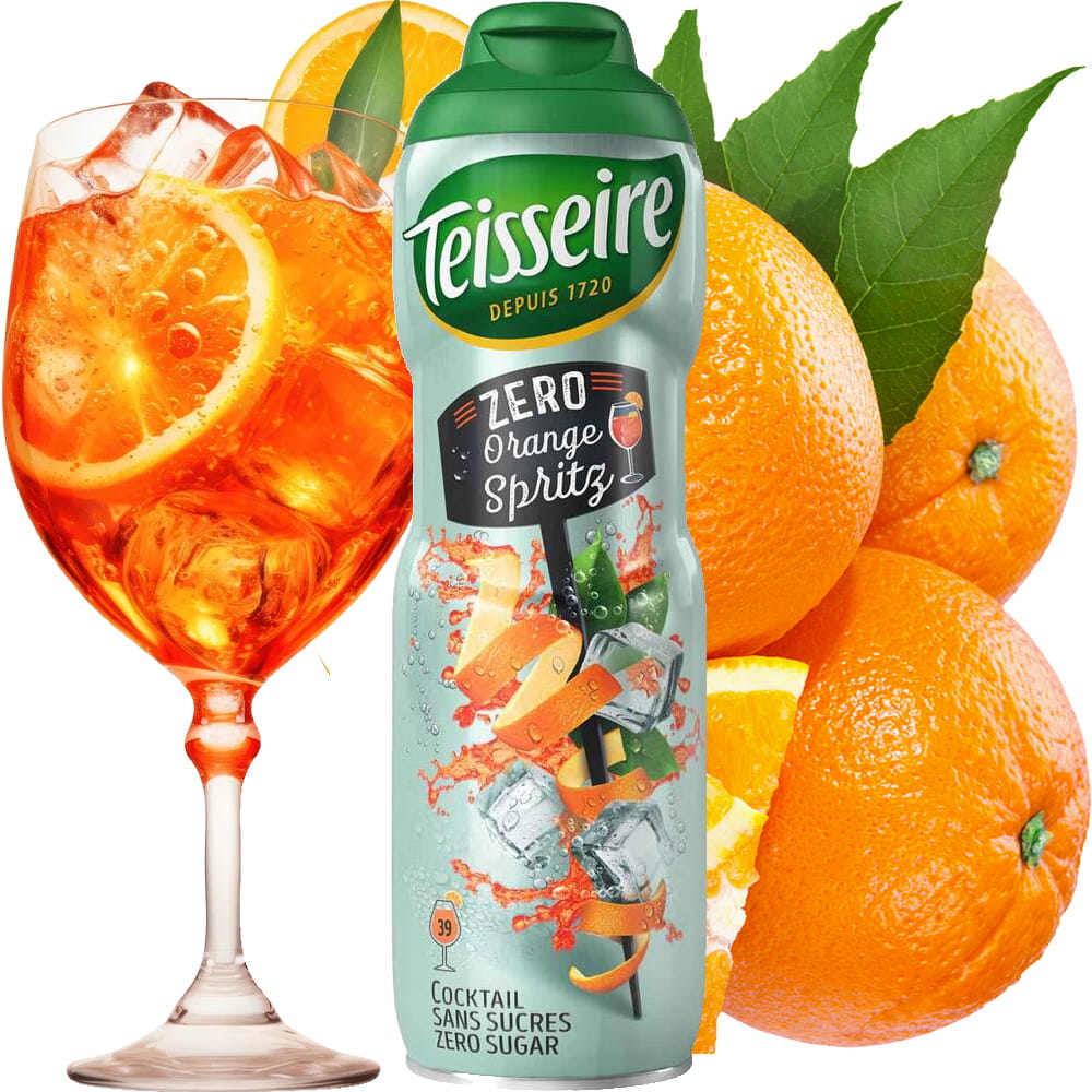 Syrop o smaku orange spritz, przygotowany z alpejskiej wody, który charakteryzuje się niską kalorycznością. Dzięki specjalnemu opakowaniu doskonale sprawdza się w domowych warunkach. Każdy syrop jest zapakowany w aluminiowy bidon o pojemności 600 ml, wystarczającą na około 40 porcji. Produkcja i sprzedaż syropów marki Teisseire rozpoczęła się w 1927 roku, a od 1959 roku firma stała się liderem w Europie w dziedzinie syropów owocowych. Ich produkty, najpopularniejsze w całej Francji, są wytwarzane od 1971 roku w Crolles we Francji i oferują różnorodne smaki, od ziołowych po owocowe, zarówno z dodatkiem cukru, jak i bez. Zamykane w pięknych, metalowych bidonach, stanowią one wszechstronną propozycję dla miłośników różnorodnych aromatów.