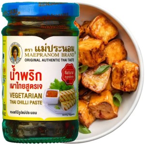 Opis: Tajska pasta chili wegetariańska w słoiku 228g, wyprodukowana przez MaePranom Brand. Pasta chili to jeden z głównych składników zupy tom yum kung jednej z najpopularniejszych tajskich potraw. Dzięki swojej ostrości, nadaje zupie bardzo pikantnego smaku i niesamowitego aromatu. Jest gęsta i bardzo intensywna w smaku i zapachu.