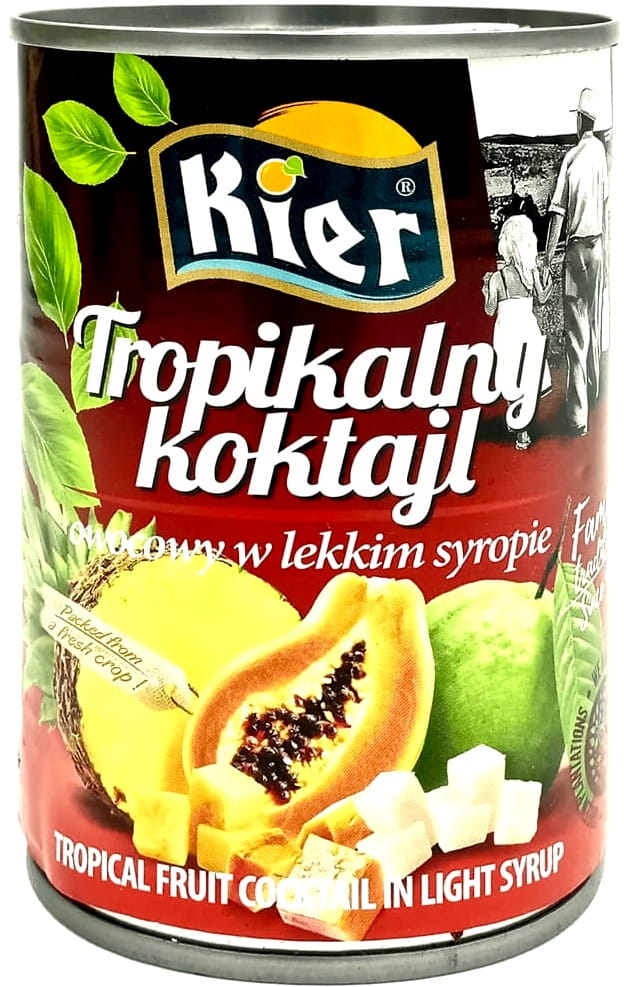 Opis: Tropikalny koktajl owocowy w syropie w opakowaniu o pojemności 425g wyprodukowany przez firmę Kier. W skład owoców wchodzą ananasy, papaja, guawa oraz kawałki kokosa. Pakowane z świeżych zbiorów.