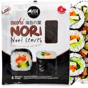 Opis: Algi do sushi w paczce 6 sztuk firmy Asia Kitchen. Idealne dla osób zaczynających przygodę z sushi. To produkt niezbędny do przygotowania sushi, to właśnie od nich rozpoczyna się tworzenie tej rewelacyjnej potrawy. Na wodoroście układa się ryż oraz inne składniki, po czym zawija się za pomocą maty bambusowej. Jakość tych wodorostów jest bardzo wysoka, a produkowane są w Korei.