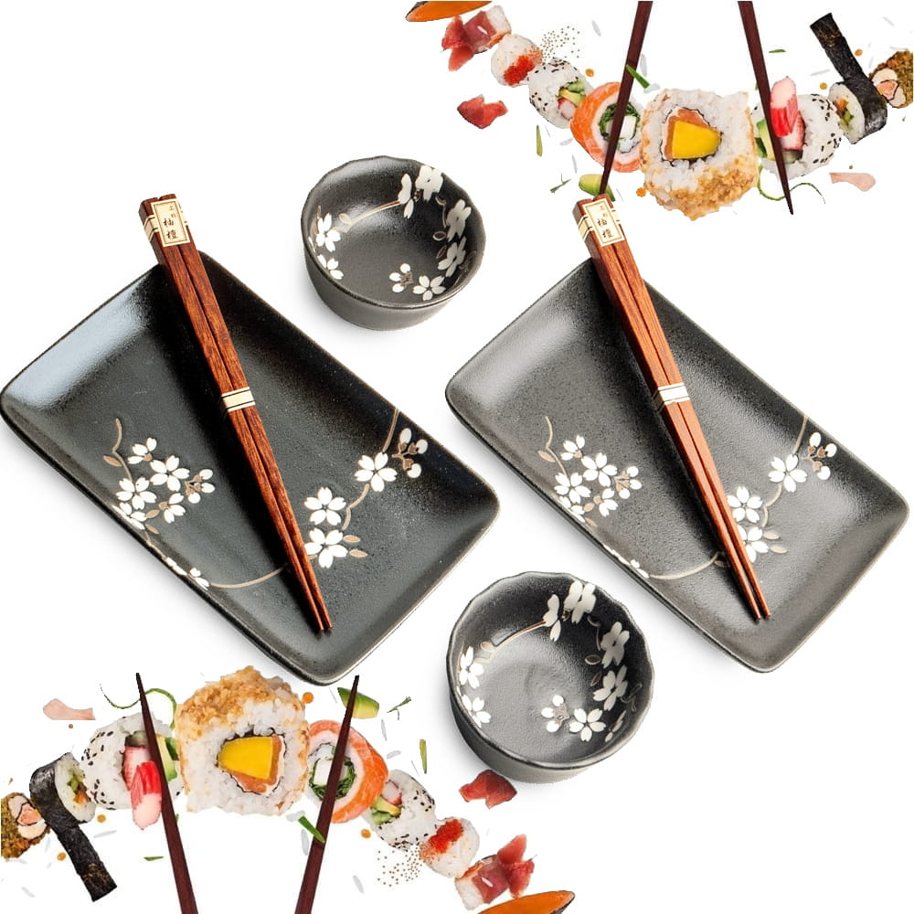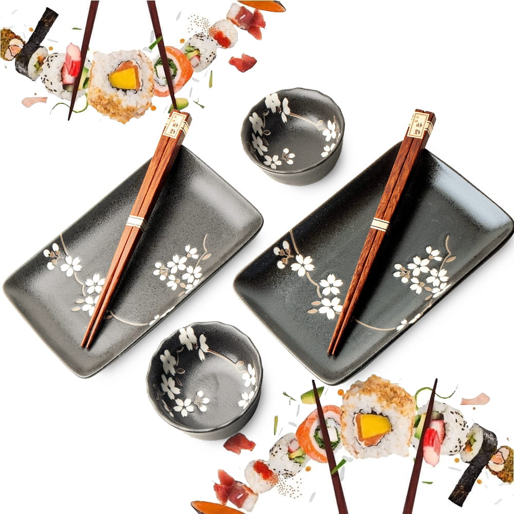 Elegancki i funkcjonalny zestaw ceramiczny do serwowania sushi dla dwóch osób w wyjątkowym, czarnym odcieniu z motywem białych kwiatów. Idealny zarówno na romantyczną kolację, jak i stylową prezentację japońskich dań dla gości.