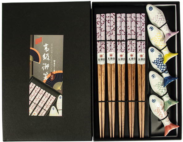 Opis: Zestaw ciemnych brązowych eleganckich bambusowych pałeczek z podstawką z motywem rybki. Komplet zapakowany jest w eleganckie pudełko idealnie nadające się na prezent. W opakowaniu znajdują się 5 par lakierowanych drewnianych bambusowych pałeczek o długości około 23m. Pałeczki zdecydowanie urozmaicą spożywanie orientalnych potraw, idealnie nadają się na prezent dla bliskiej osoby.