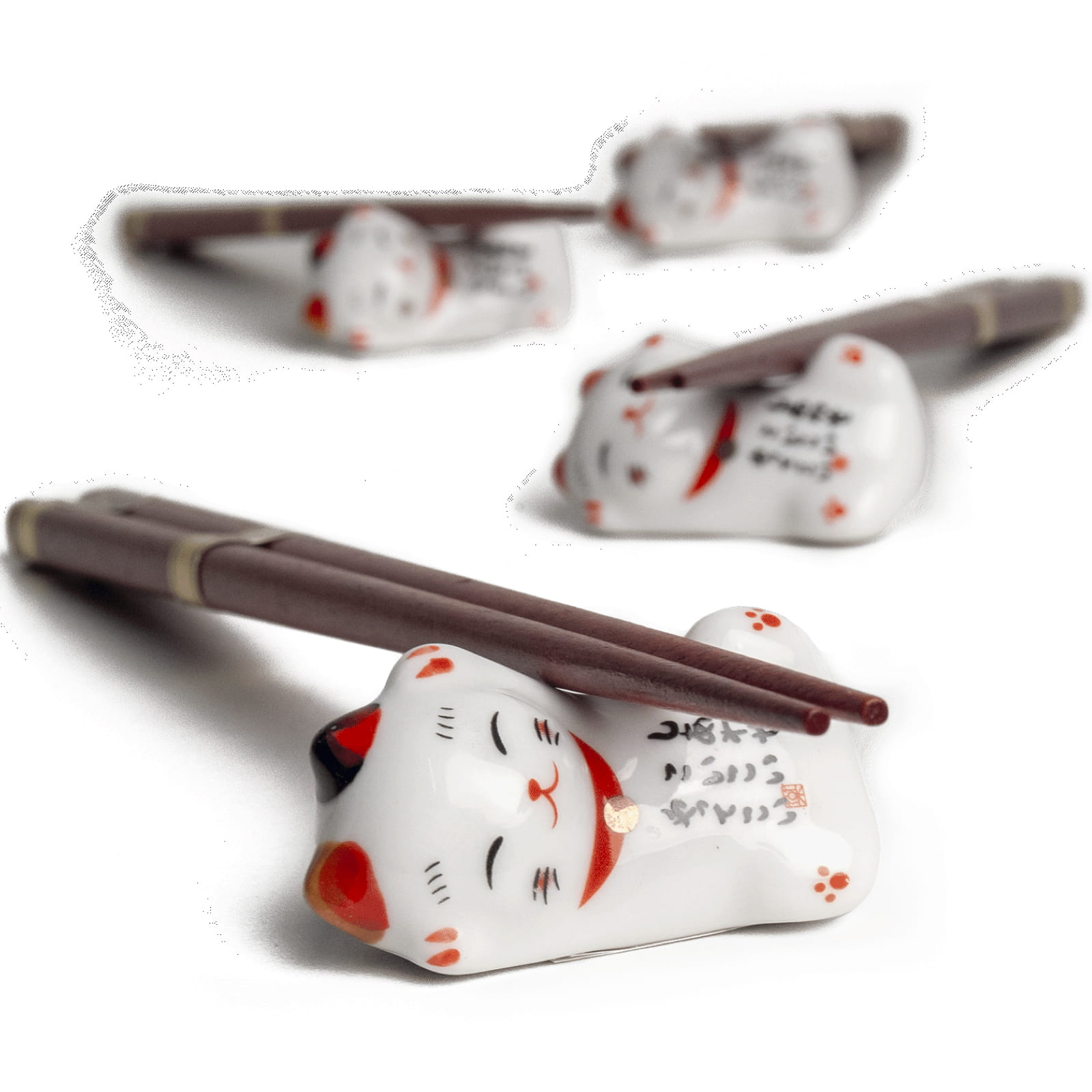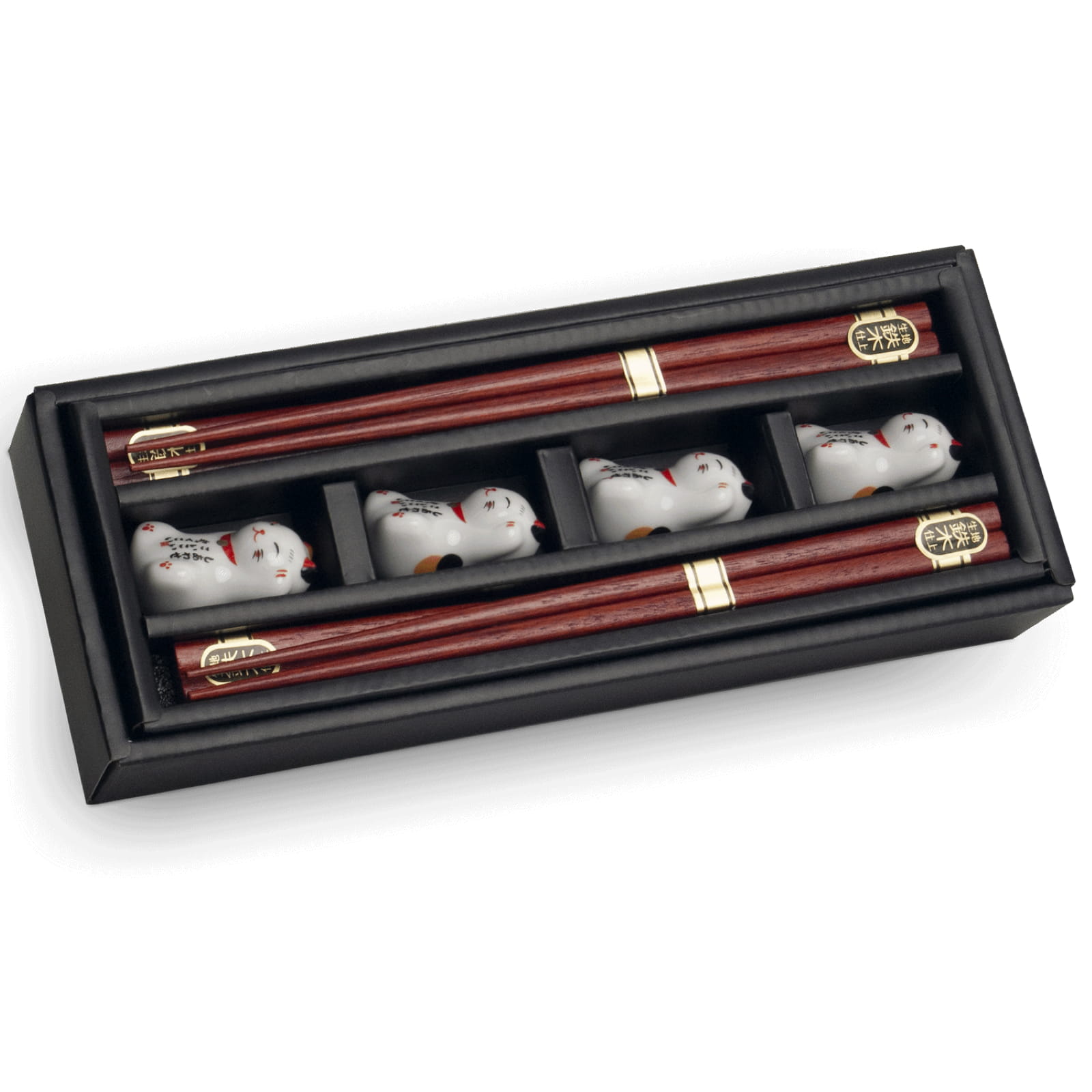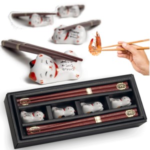 Zestaw Ciemnych Japońskich Pałeczek z Podstawką w Pudełku Motyw Kotków Maneki-Neko 4 Pary 22,5cm EMRO AZIATICA